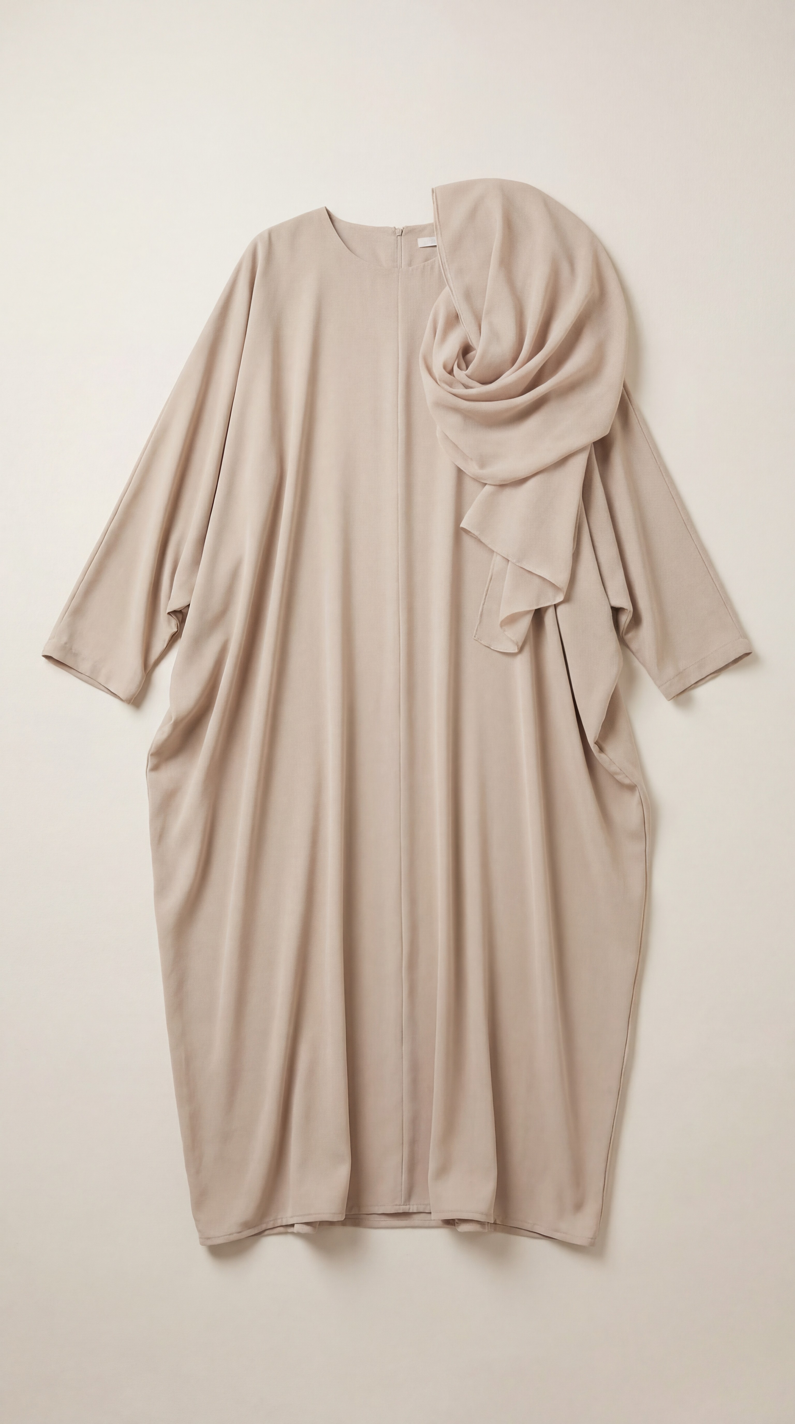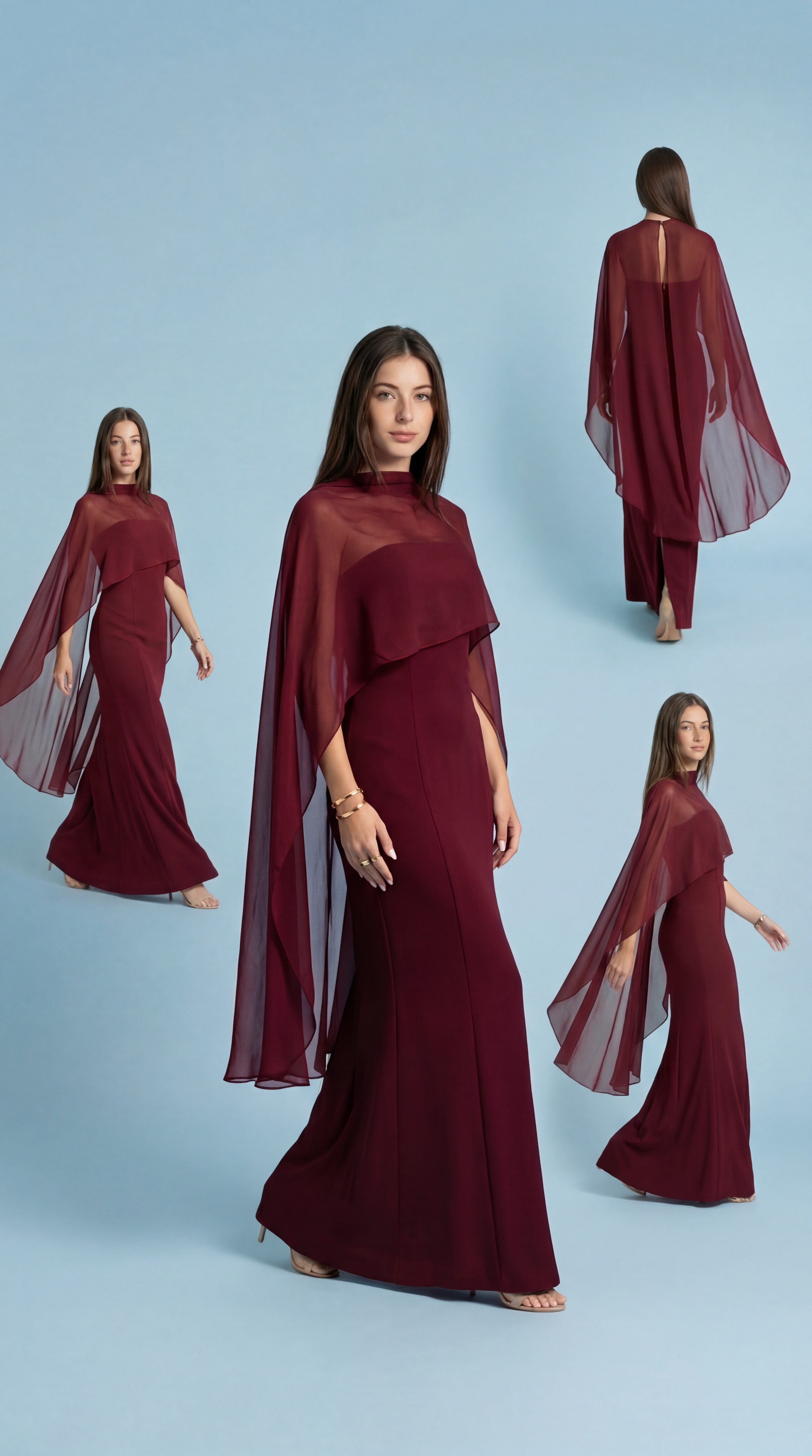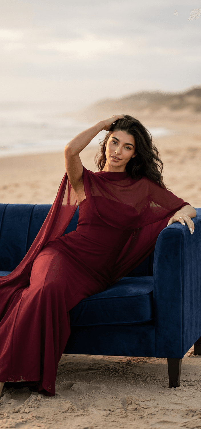 High-fashion editorial look with natural pose, dramatic but soft lighting, premium styling, clean composition, realistic skin tones and fabric details.