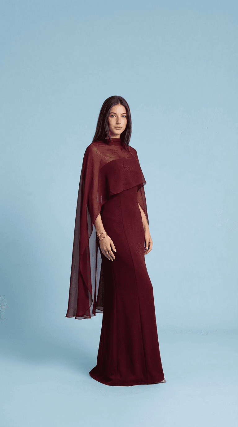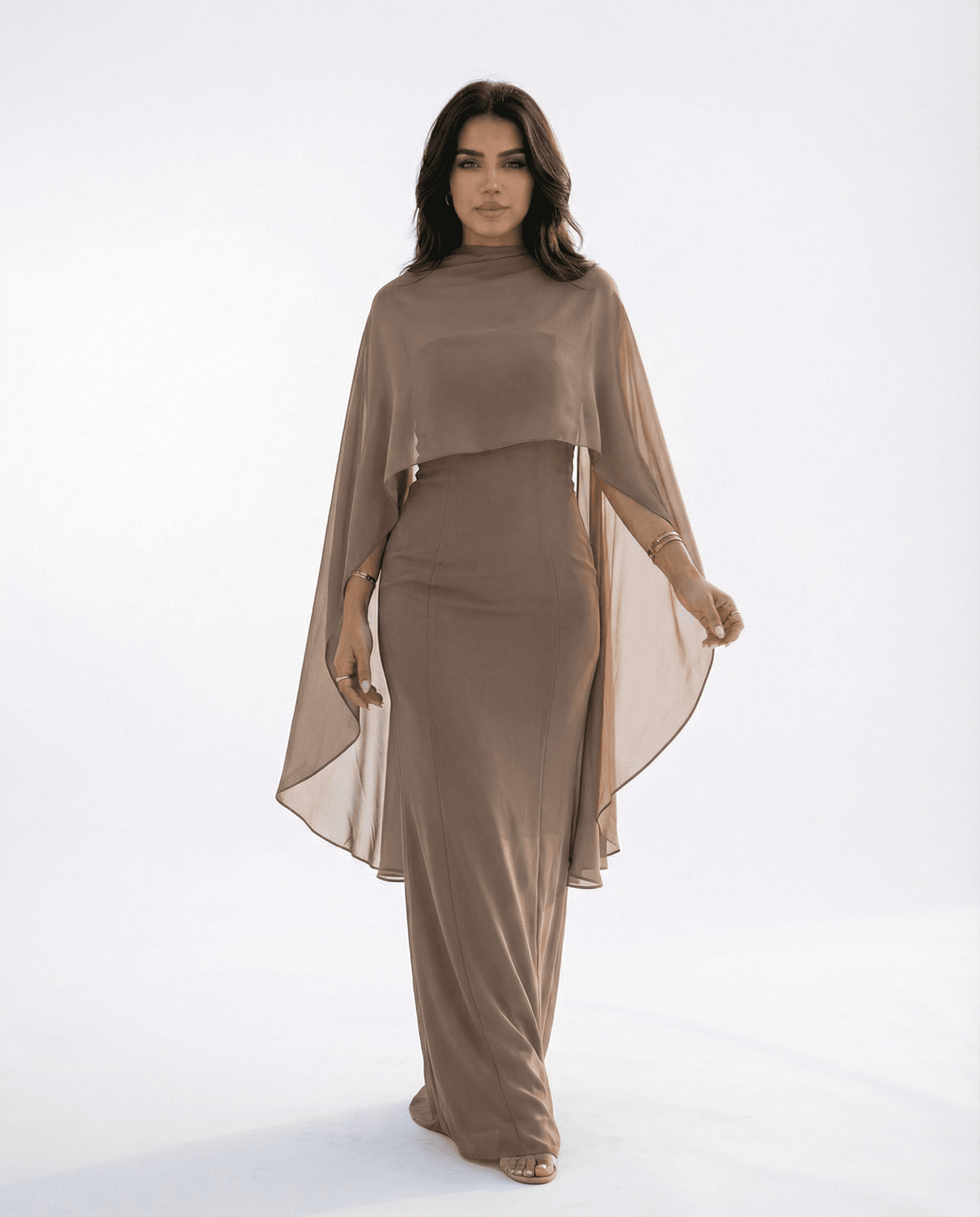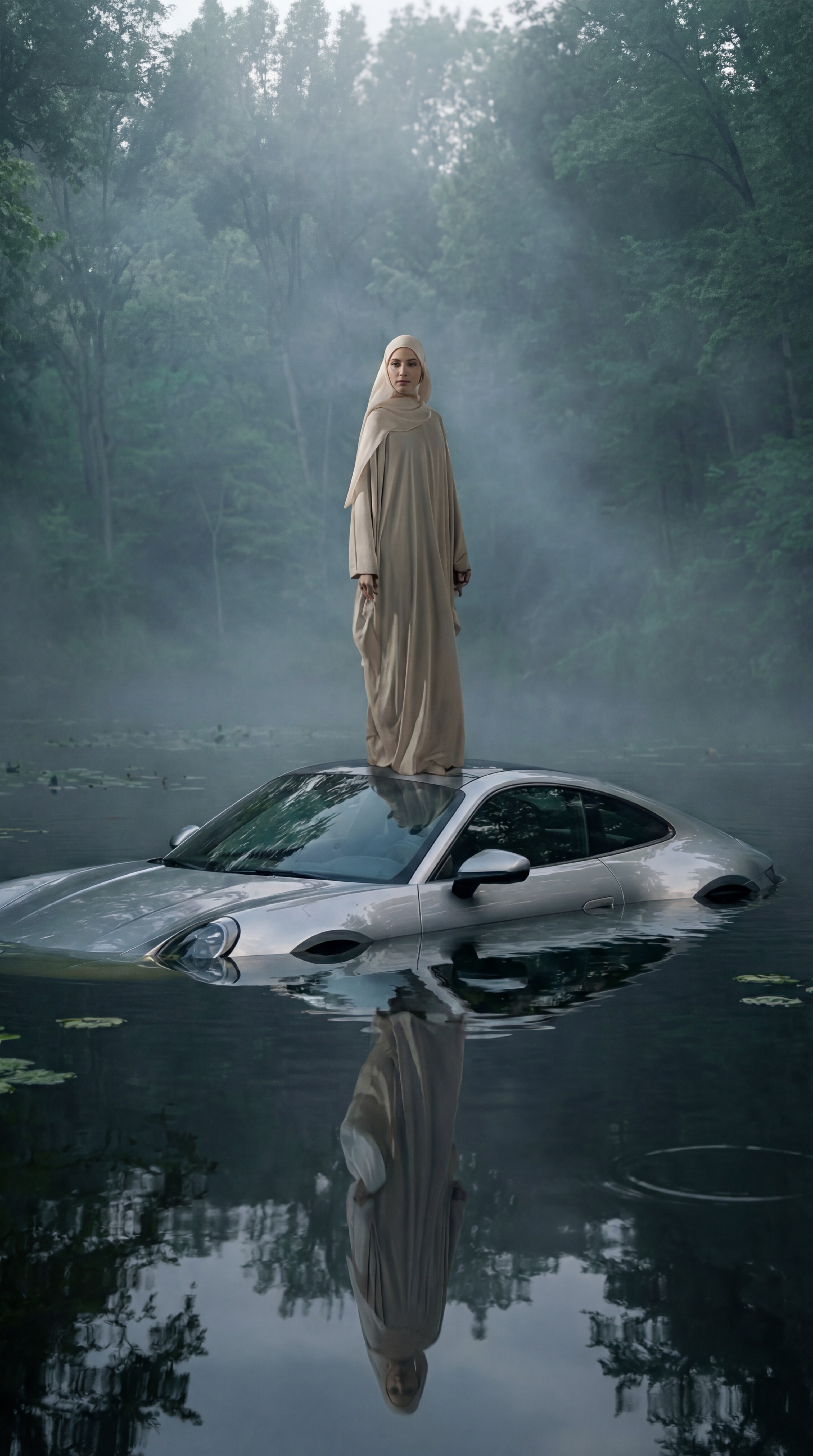 High-fashion editorial look with natural pose, dramatic but soft lighting, premium styling, clean composition, realistic skin tones and fabric details.